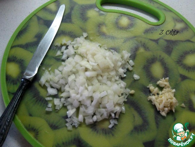 Пока тушится тыква, мелко нарезать лук и чеснок.