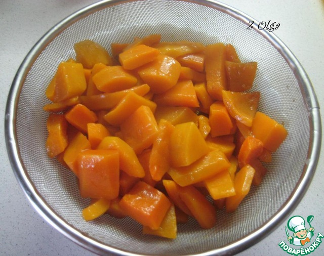 Тыква стала мягкой, дала сок и стала еще янтарней. Лишнюю жидкость нужно слить.