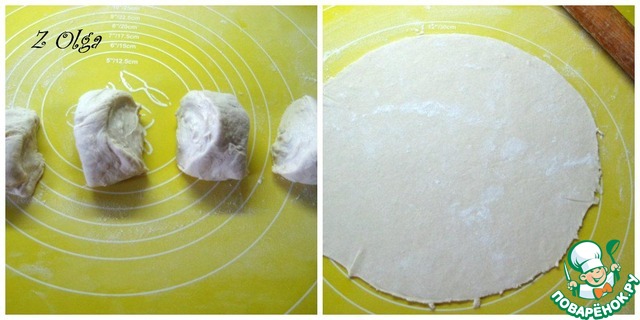 Наше тесто отдохнуло. Делим его на 4 часть. Тонко раскатываем в круг диаметром примерно 25 см.