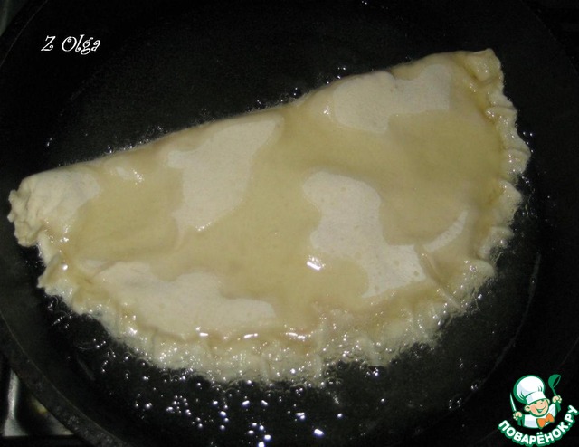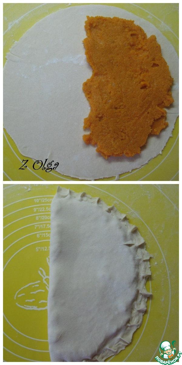 Выкладываем начинку на половину кружка, не доходя до края на 1-1.5см. Осторожно накрываем второй половинкой круга, защипывая края.