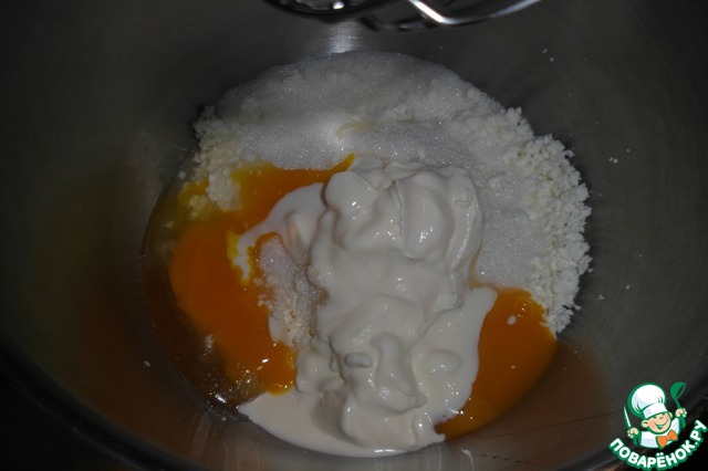 4. Миксером смешиваем творог и сахар, добавляем яйцо, желток, сметану, ванилин.