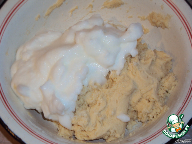 Белки взбить в густую пену с маленькой щепоткой соли. Выложить их в маслянистое тесто и осторожно перемешать ложкой сверху-вниз.