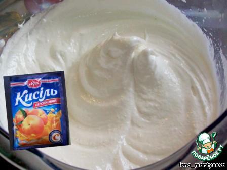 5 белков взбиваем до устойчивой пены, постепенно добавляя 1,5 стакана сахара. В конце взбивания всыпаем пачку сухого киселя. На всякий случай я его сфотографировала...