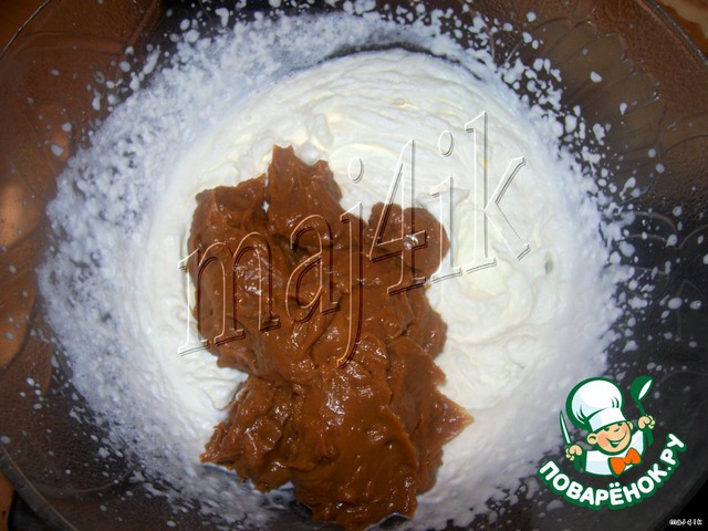 Добавить банку варёной сгущенки и перемешать миксером на маленькой скорости.