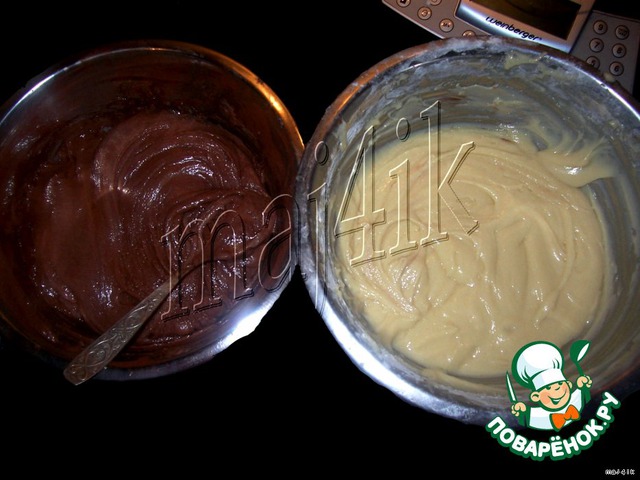 Испечь из каждой половины теста по 2 коржа, предварительно наколов их вилкой - получится 2 коричневых и 2 белых коржа.