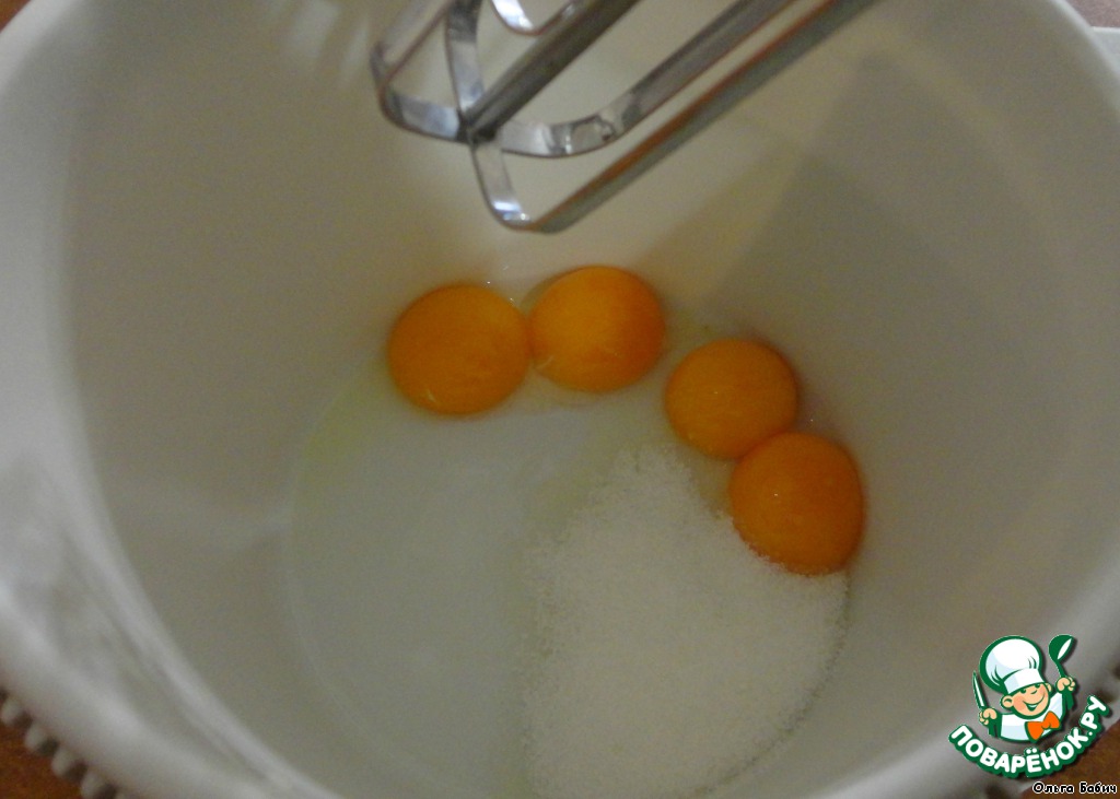 Взбить желтки с 2 ст.л. сахара минут 10.