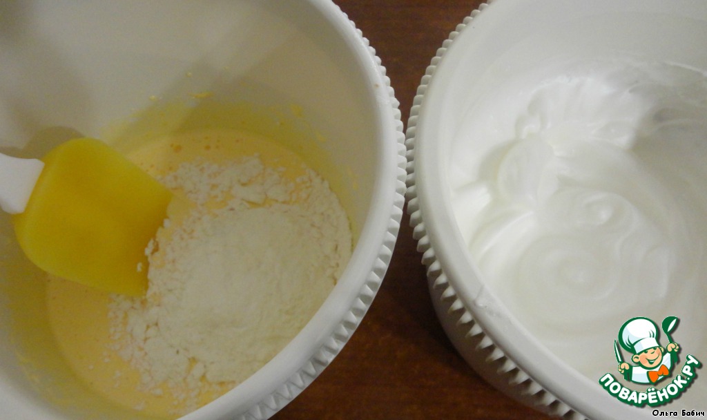 Добавить в желтковую массу, постепенно добавляя белковую массу.