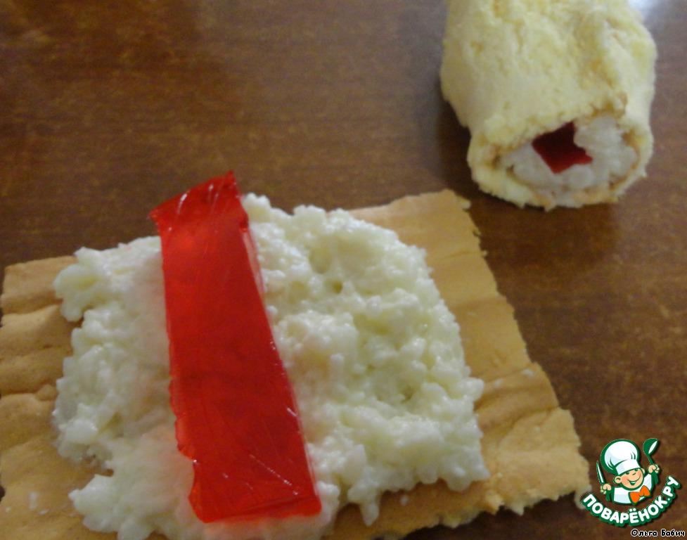 На начинку укладываем предварительно нарезанное желе - брусочки - 8 см диной и 1 см высотой.