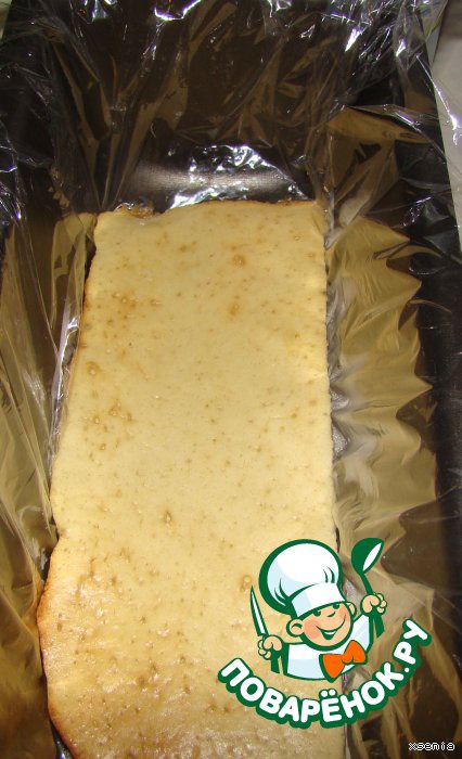 Подберите глубокую форму в которй вы будете выкладывать наш тортик...Разрежем корж на 2 или три части...зависит от формы(Я брала форму для кексов)...Застелем форму пленкой...выложим на дно первый слой теста...