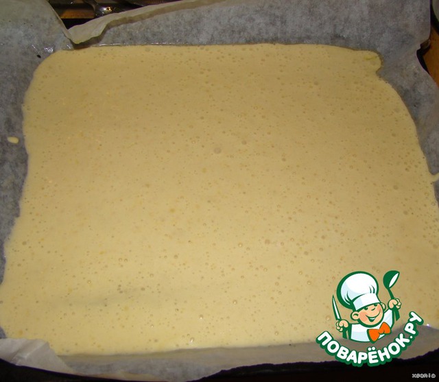 Добавляем муку...Отдельно взбиваем белки в крутую пену....перемешиваем с желтками и мукой.....Тесто выливаем на противень застеленый пергаментной бумагой смазанной сливочным маслом...и выпекаем примерно 10 минут при температуре 220