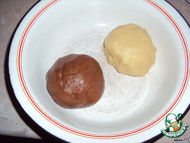 Тесто разделить на две части. В одну часть добавить какао и хорошо вымесить. Поставить чашку с тестом в холодильник минут на 40-50.