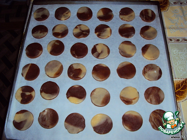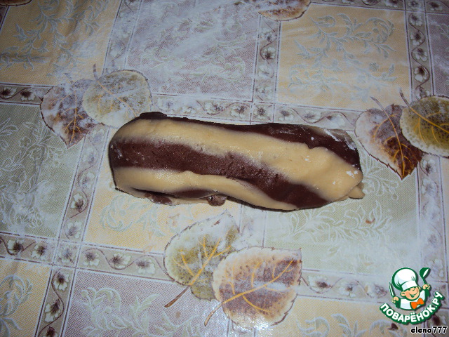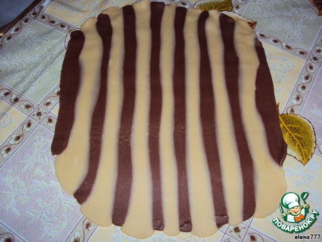 Вынуть тесто и из каждой части скатать жгутики. Разложить их на присыпанном мукой столе поочерёдно, вплотную друг к другу - тёмный жгутик, светлый, тёмный, светлый и т.д. Раскатать в пласт.