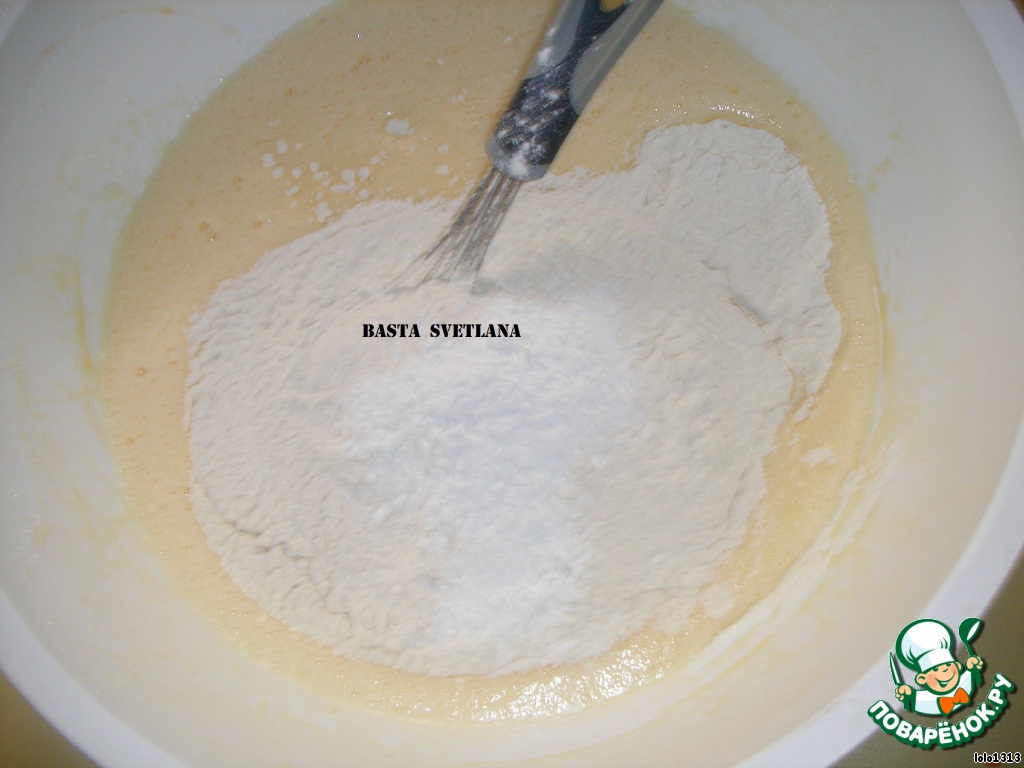 Добавляем растительное масло, разрыхлитель, муку - хорошо взбиваем.