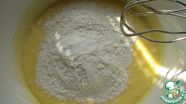 Муку с разрыхлителем просеять в миску. Порционно добавляем во взбитую массу и вымешиваем.