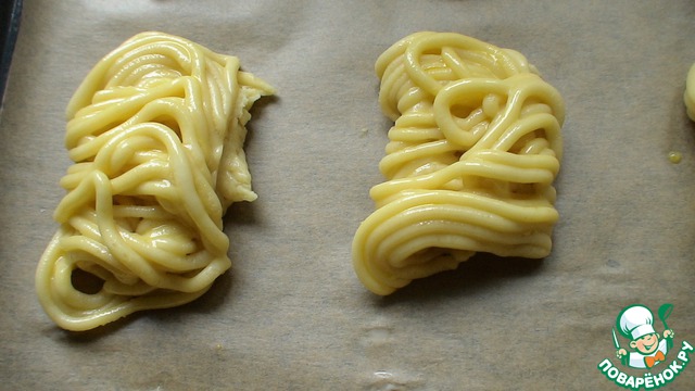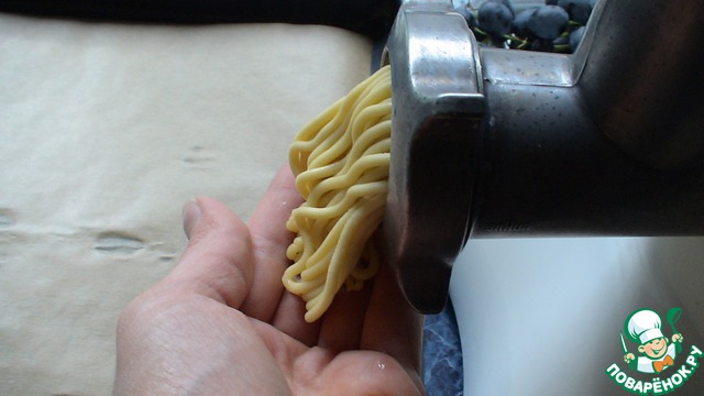 Пропускаем тесто на мясорубкe и отделяем ножом по форме печенья.
