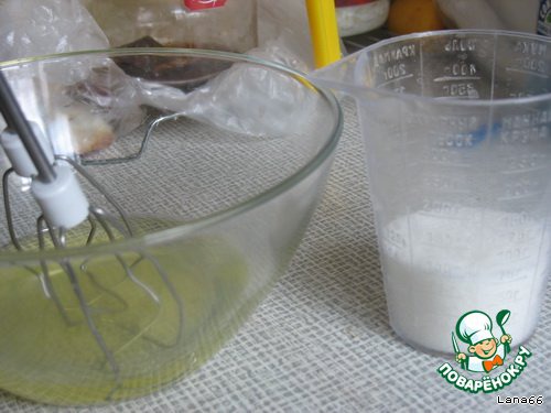 В отдельной миске взбить белки. Сначала взбивать медленно, затем увеличить скорость до максимальной и взбивать до тех пор, пока при наклоне миски белки не будут выливаться из миски. Не прекращая взбивание, небольшими порциями ввести оставшийся сахар (0,5 стакана).