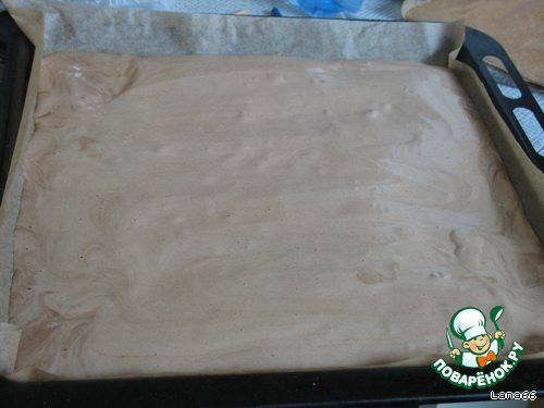 Аккуратно выложить тесто на застеленный пергаментом противень и равномерно распределить по всей поверхности. Выпекать бисквит ~10 минут в нагретой до ~180°C духовке (корж не нужно сильно зарумянивать).