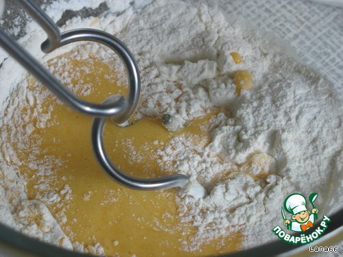 Ввести в желтки с сахаром муку с разрыхлителем и ванилином и перемешать до однородности.