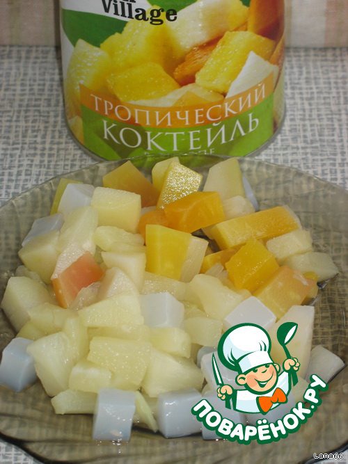 С консервированных фруктов слить сок. Толстые кусочки фруктов порезать тоньше.Сливки взбить с сахарной пудрой до образования густой кремообразной консистенции.