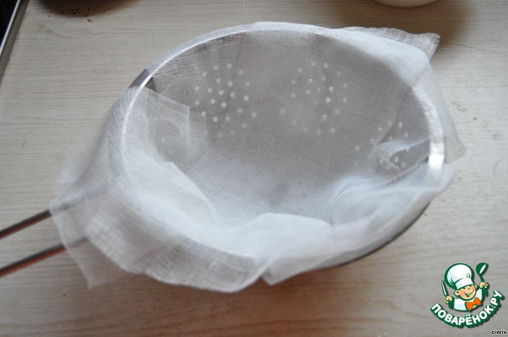 Для начала займемся кремом. Крем, как вы догадались, будет сметанным. Он придаст приятную кислинку ароматным медовым коржам. Но чтобы наша сметана не потекла, когда мы добавим в нее сахар, и чтобы не пользоваться загустителями, мы сметану немного отцедим. Для этого нужен дуршлаг и марля в два слоя. Моя марля куда-то задевалась, поэтому пришлось проложить широкий бинт.