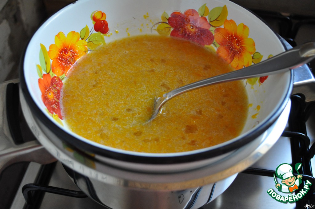 Теперь займемся тестом. На водяной бане смешать мед, молоко, сахар, яйцо, масло, соду. Можно добавить щепотку лимонной кислоты (чтобы сода хорошо погасилась).