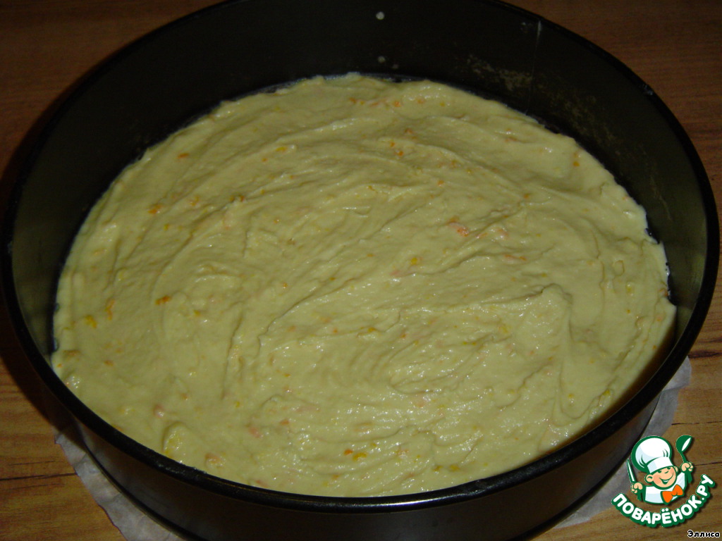 Разъемную форму (28см) застилаем пищевой бумагой, на нее выкладываем и разравниваем тесто, выпекаем при температуре 180 град. до золотистого цвета.
