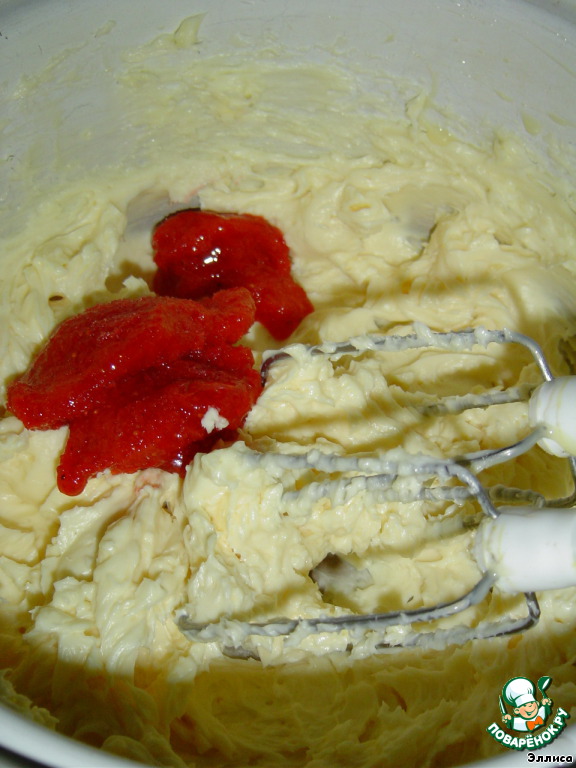 Теперь приступаем ко второму крему. Для этого взбиваем размягченное масло, к нему добавляем сгущенное молоко и клубнику, перетертую с сахаром (у меня она замороженная).