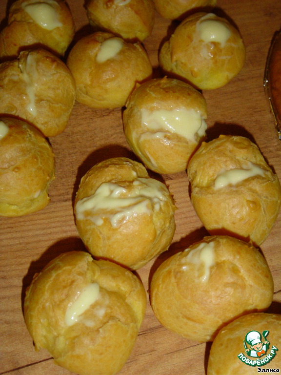 Когда у нас все подготовлено, приступаем к сборке. С помощью кондитерского шприца наполняем профитроли заварным кремом,