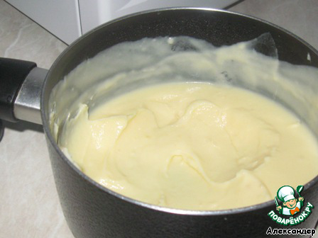 Готовим крем. Для этого кастрюлю с антипригарным покрытием с молоком (500 мл) ставим на огонь. 3 желтка растираем с 1/2 стакана сахара и 2 столовыми ложками муки. Если смесь густая, добавьте пару ложек молока. Вводим эту смесь в молоко, когда оно почти закипит. Варим, непрерывно мешая, до загустения. Это минут 5. Выключаем, добавляем ваниль.