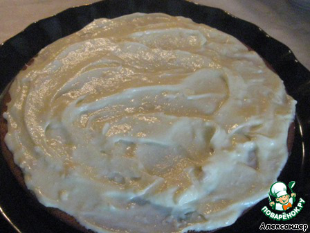 Корж смазываем половиной белого крема.