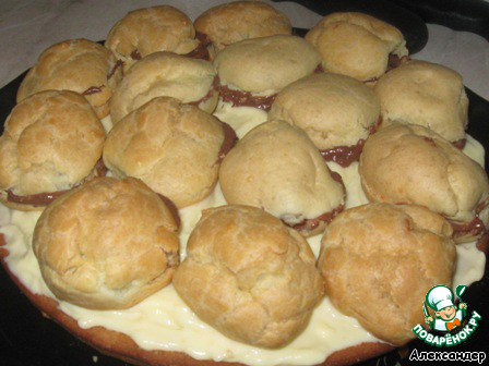 Профитроли начиняем шоколадным кремом и выкладываем на корж.