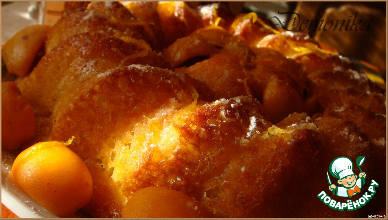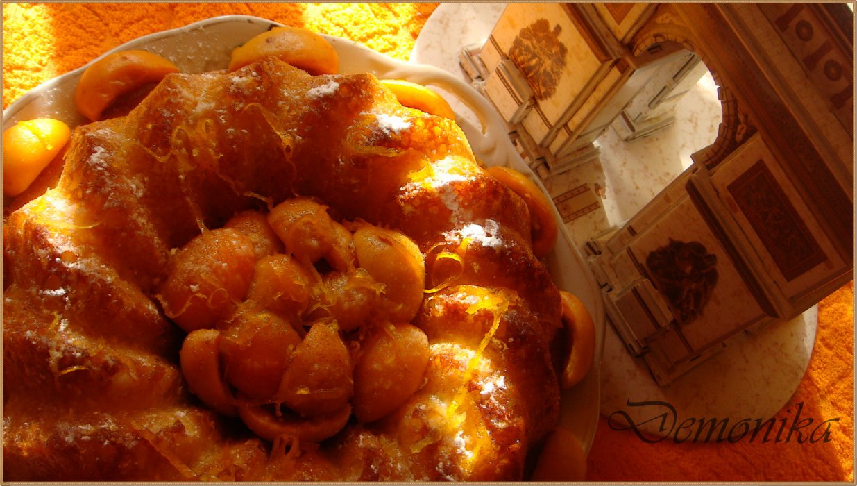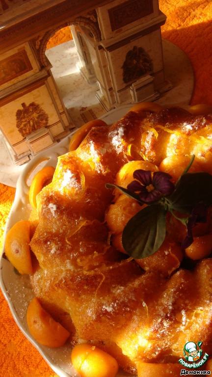 Переложить саварен на сервировочное блюдо. Абрикосы, которые остались без сиропа, выложить в отверстие посередине и вокруг саварена. Посыпать сахарной пудрой и украсить цедрой лимона и апельсина.