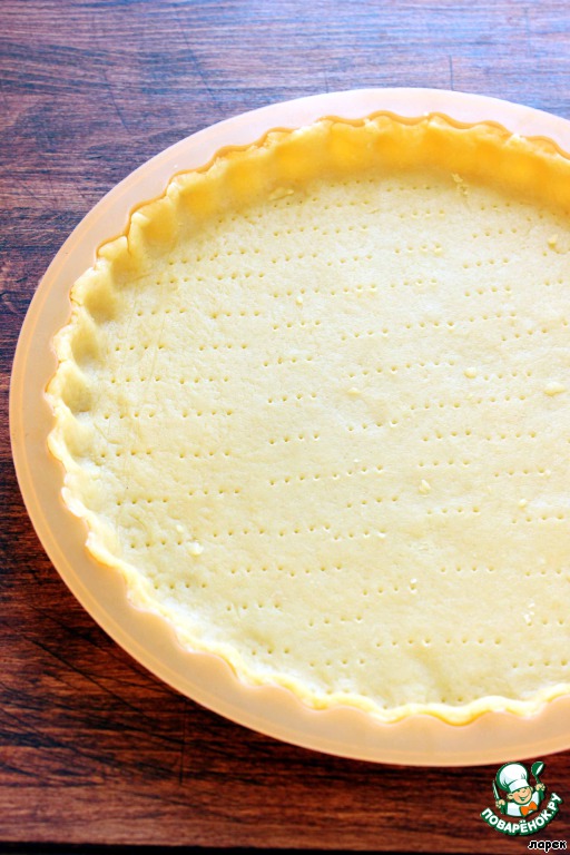 Раскатайте охлажденной тесто в лепешку. Круглую форму диаметром 22-26 см смажьте маслом и выложите в нее тесто, сделав бортики. Наколите вилкой. У меня тесто осталось, поэтому сделала еще три корзинки.