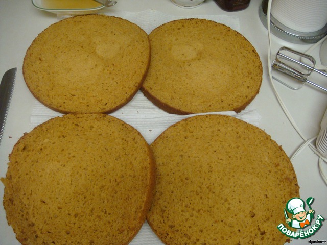 Каждый корж пропитать сиропом, затем смазываем хорошо кремом и складываем друг на друга, сверху обмазать оставшимся кремом и украсить. Я еще пересыпала тертым шоколадом между коржами.