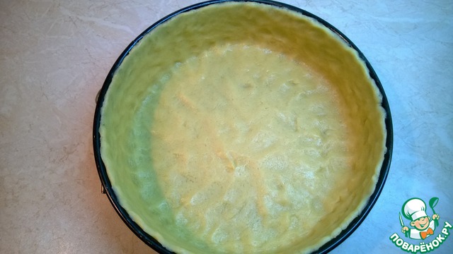 Дно разъёмной формы (26 см) смазать маслом. 2/3 теста раскатать по дну, проколоть в нескольких местах вилкой. Остальное тесто скатать в ролик, уложить по краю формы и, прижимая к стенкам формы, поднять бортики 3-4 см высотой.