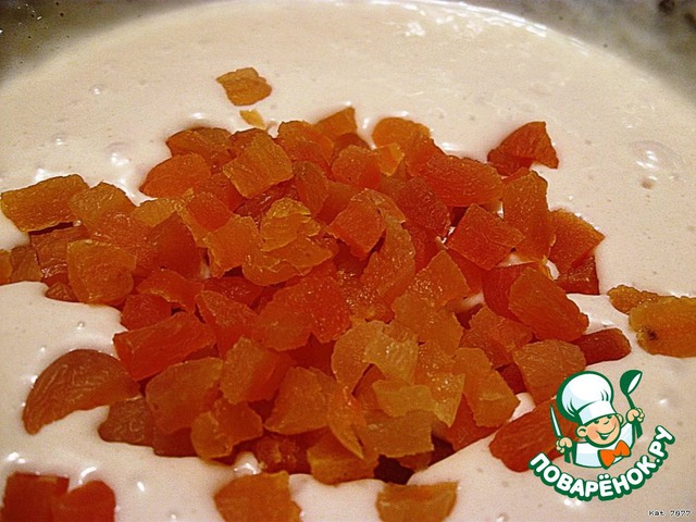 В тесто добавить курагу или изюм, по желанию и перемешать ложкой. Тесто выложить в форму для запекания, застелив бумагой для выпечки и слегка смазав раст. маслом и поставить выпекаться в духовку на 30 минут при t-200 С