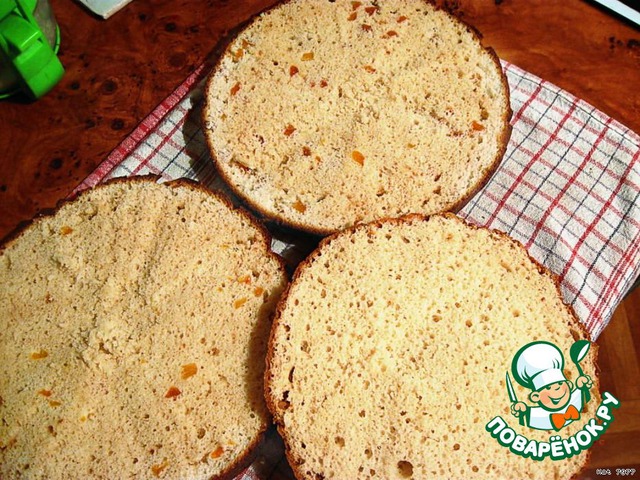Готовый бисквит оставить в выключенной духовке минут на 5. Затем разрезать его на 3 части и оставить остывать 10-15...