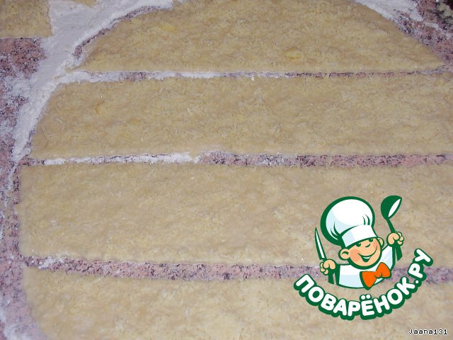 Разрезать на полоски. Противень застелить бумагой и выложить на него полоски.