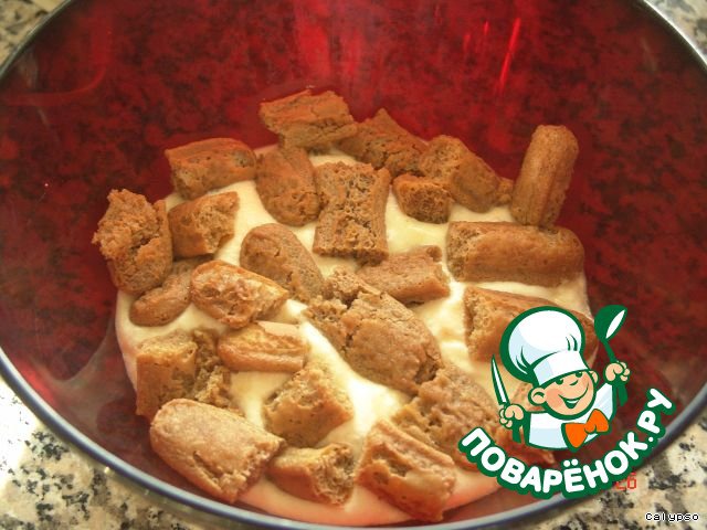 В заранее приготовленную красивую форму (можно сразу разложить по креманкам) выкладываем 1/3 часть смеси. Палочки печенья разламываем на 3 части и пропитанные в кофейно-ромовой смеси кусочки укладываем на поверхность крема. Пропитывать печенье надо очень быстро, не давая ему размокнуть.