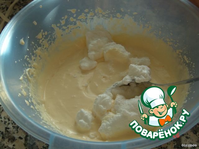 Осторожно перемешивая ложкой, постепенно вводим взбитые белки в желтковый крем.