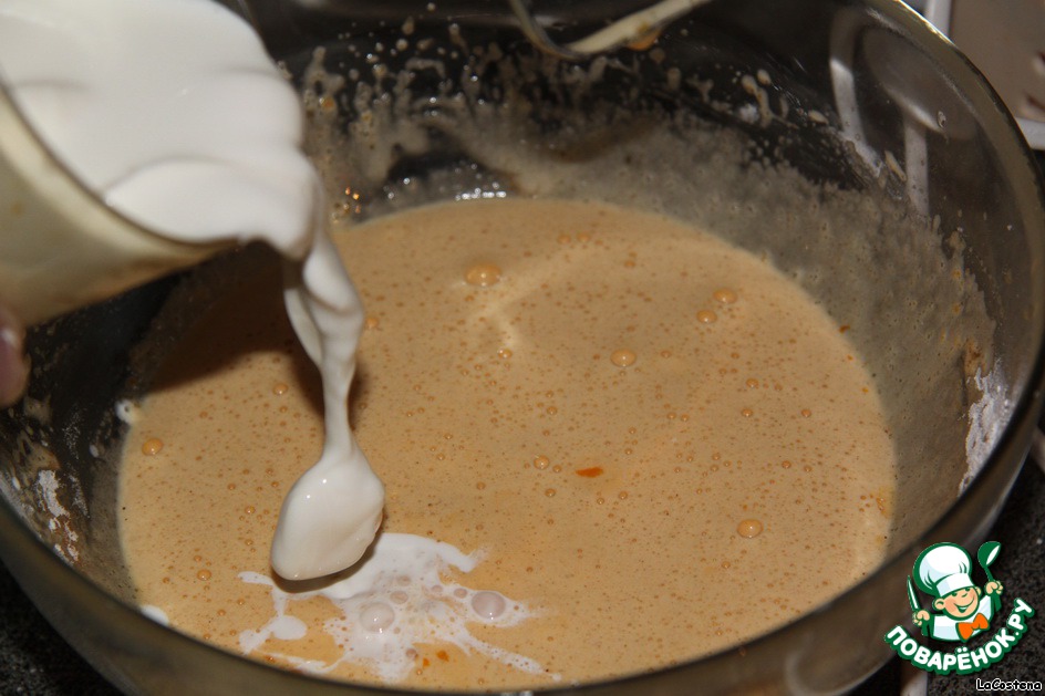 Вводите сливки и молоко, продолжая взбивать крем на медленной скорости.