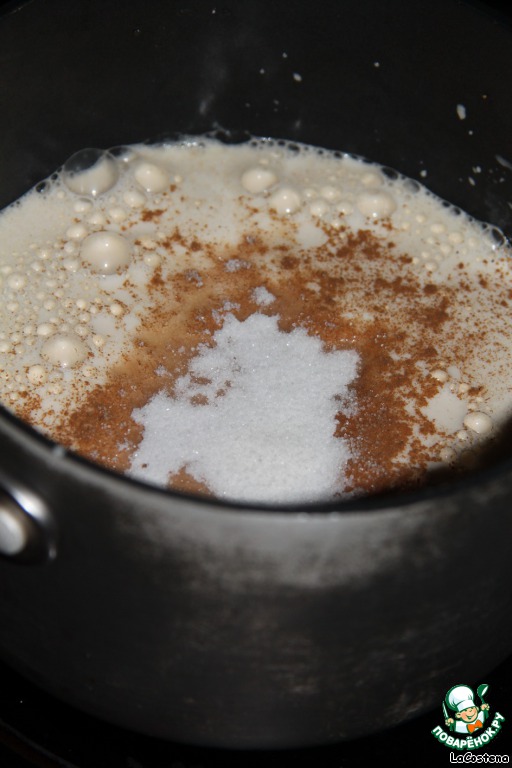 Вылейте крем в кастрюлю с толстым дном, добавьте корицу (1 ст.л. ложку) и ванильный сахар.