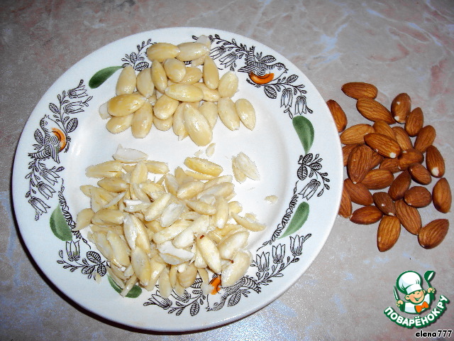 Миндаль залить кипятком, дать постоять несколько минут. Снять кожицу (снимается легко) и нарезать миндаль на длинные палочки.