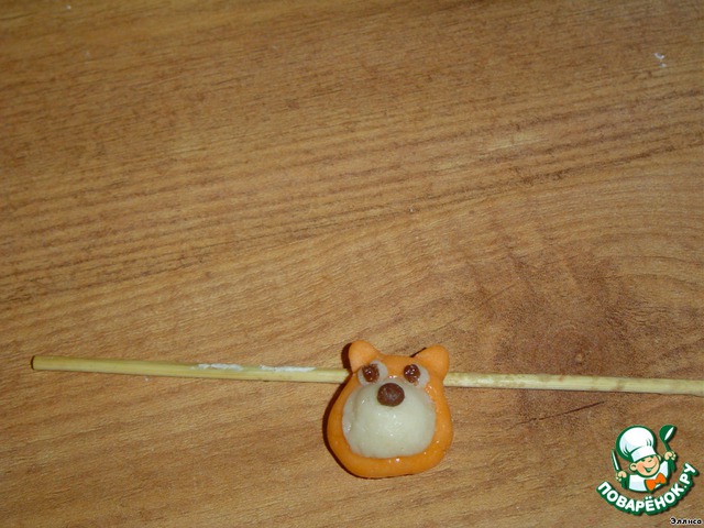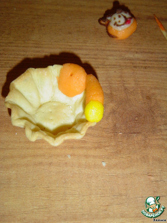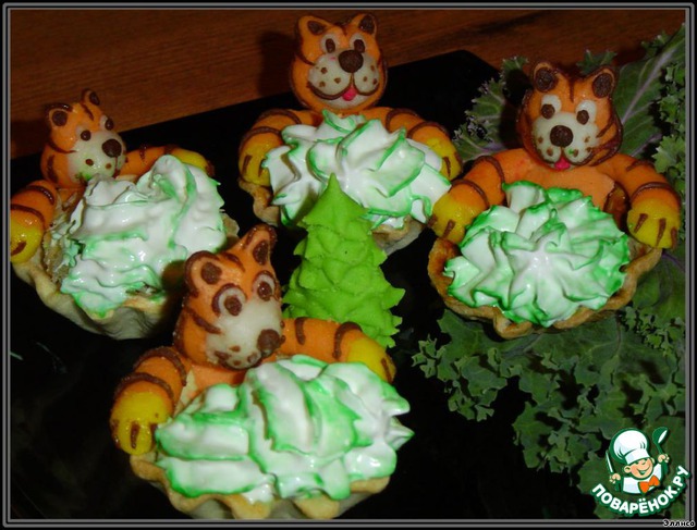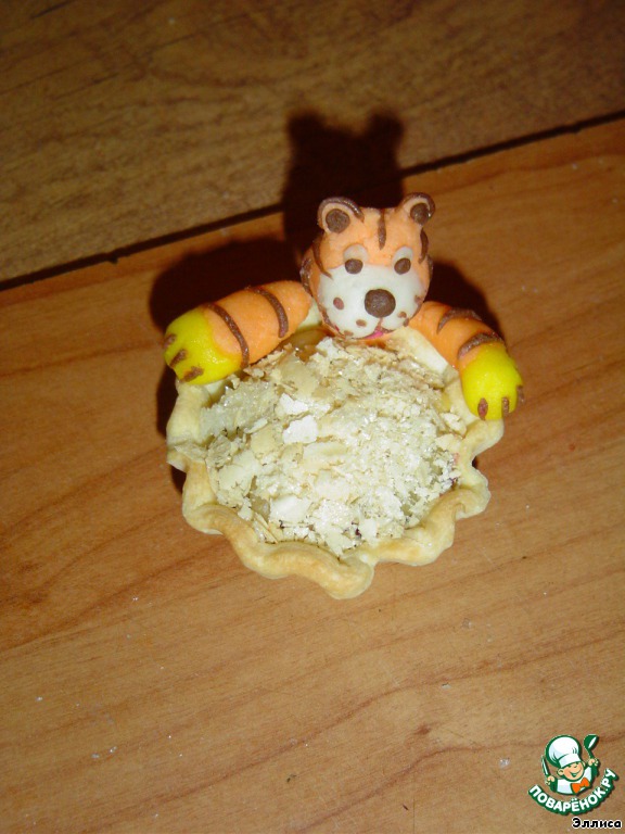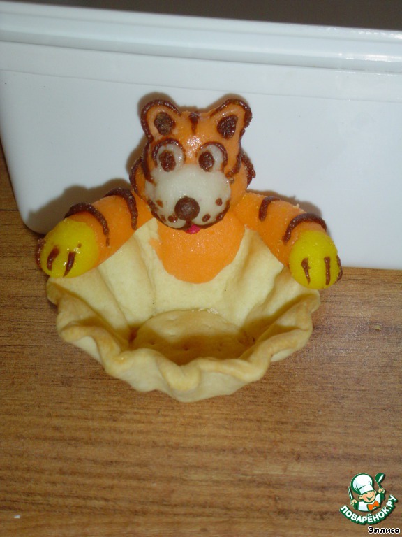 Тарталетки готовы и мы приступаем к изготовлению тигрят. Нам понадобится мастика, ее можно приготовить по этому рецепту - http://www.povarenok.ru/recipes/show/4421/. Из оранжевой и белой мастики лепим мордашку тигра.