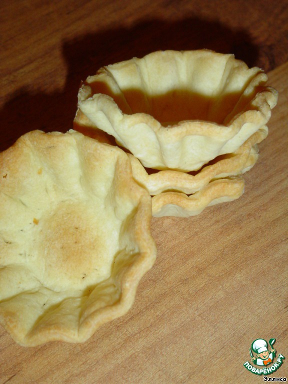 Начинаем с приготовления тарталеток. Готовим тесто для тарталеток, для этого в молоке растворить сахар, соль, часть муки и желток, хорошо перемешать. Размягченный маргарин взбиваем, соединяем с приготовленной массой и остатком муки. Раскатываем тесто и вырезаем кружки по размеру формочек. Выкладываем кружочки в формы, смазанные маргарином, дно прокалываем вилкой. Выпекаем при температуре 190-200 гр. до золотистого цвета.