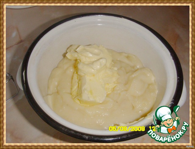 Добавить размягченное сливочное масло и хорошо взбить миксером