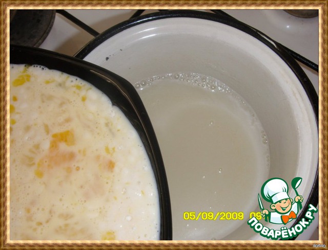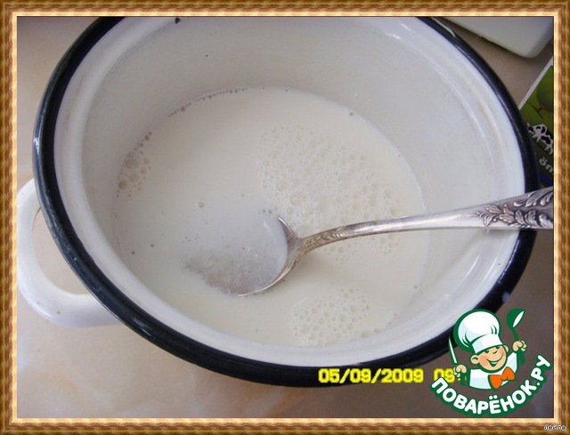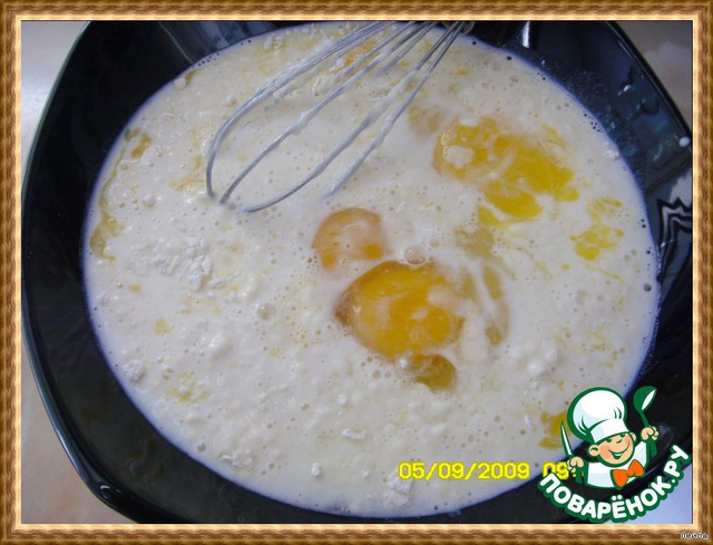 б) 1 ст молока + 2 яйца + 3 ст л муки перемешать. В смеси могут остаться комки, но не обращайте на них внимания - они разойдутся в конце.