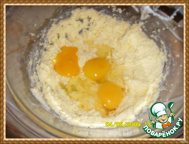 Взбить яйца и дополнительный желток в пену. Добавить в сливочное масло с сахаром.Хорошо все перемешать до однородной массы.