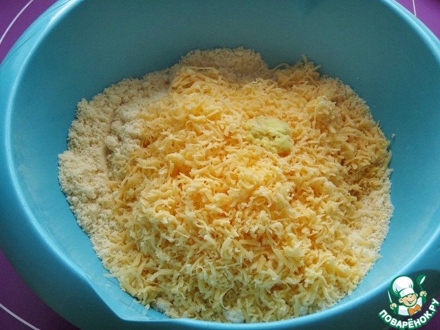 Далее добавляем сыр и имбирь. Замешиваем однородное эластичное тесто. Если вдруг тесто рассыпается, добавьте 2-3 ст. л. кипячёной водички.