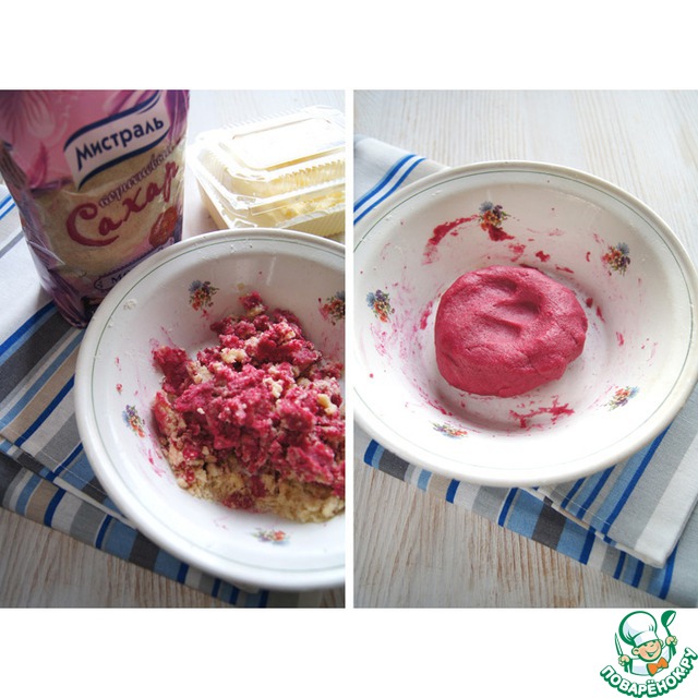 Для песочного теста в миске смешать 88 г. муки и по 75 г. сахара и размягчённого сливочного масла. Перетереть вручную до относительной однородности, добавить сок свеклы, и месить тесто, пока оно не приобретёт однородный цвет.